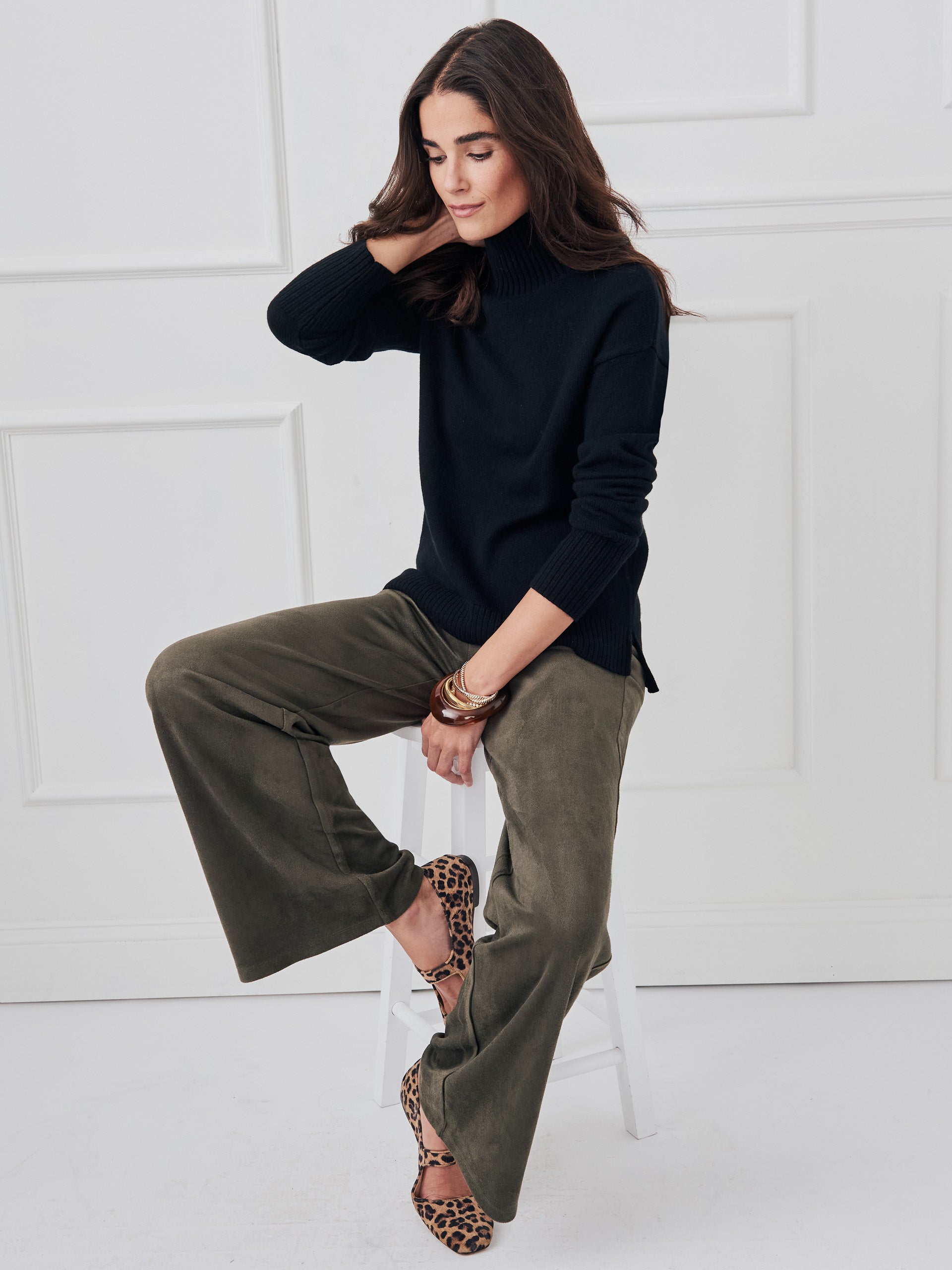 Pull on Elastic waistband Wide leg Faux Suede (92% Polyester, 8% Spandex) Machine wash cold. Tumble dry low. Imported Size & Fit31″ inseam, 11.5″ front rise, 23″ leg opening (size 8) Gabby is 5’9.5″ and wearing a size 0