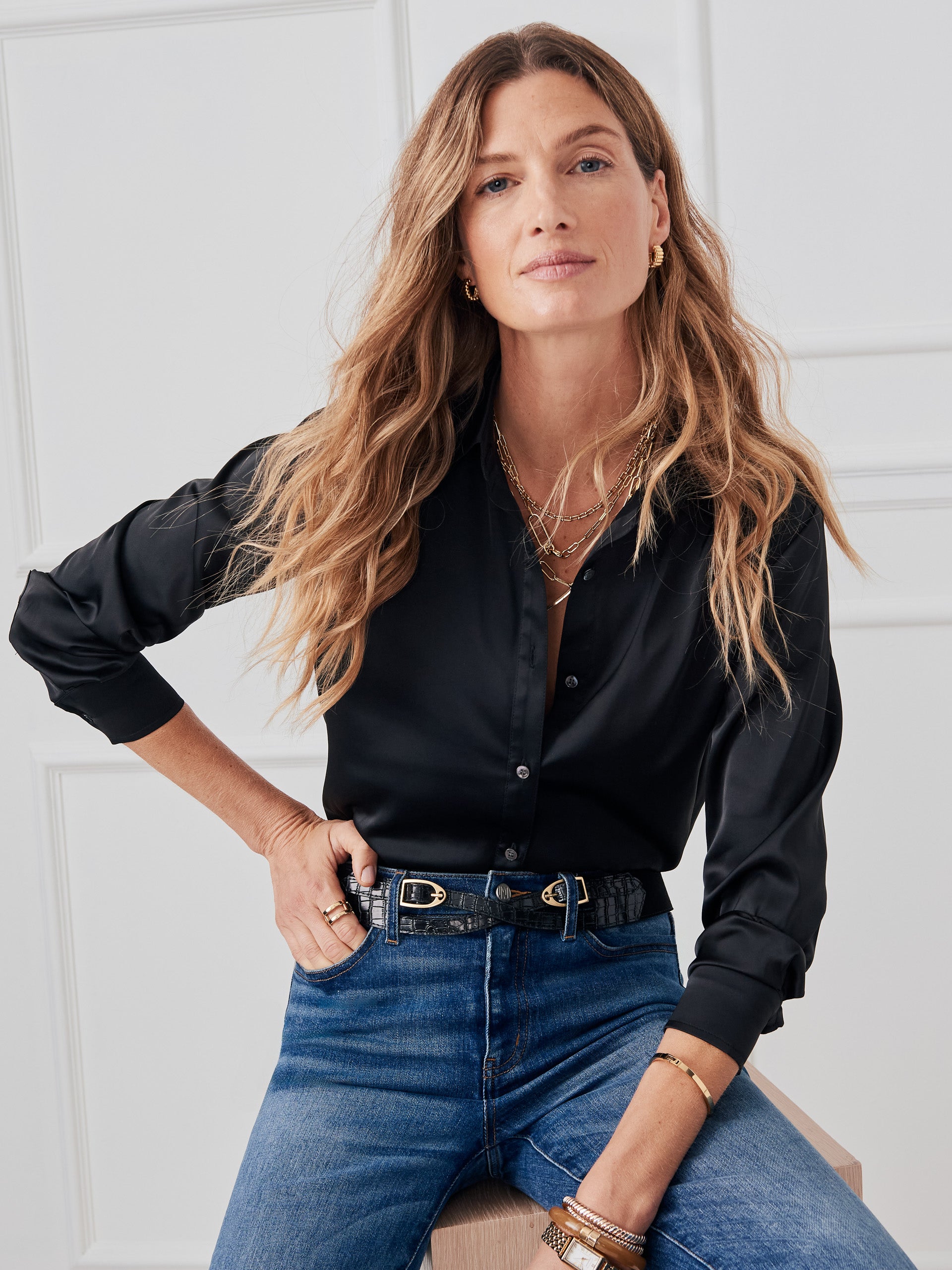 Long sleeve Front buttons Poly Satin (97% Polyester, 3% Spandex) Machine wash cold. Lay flat to dry. Imported. Size & Fit28.25″ long from center back Vanessa is 5’11” and wearing a size XS