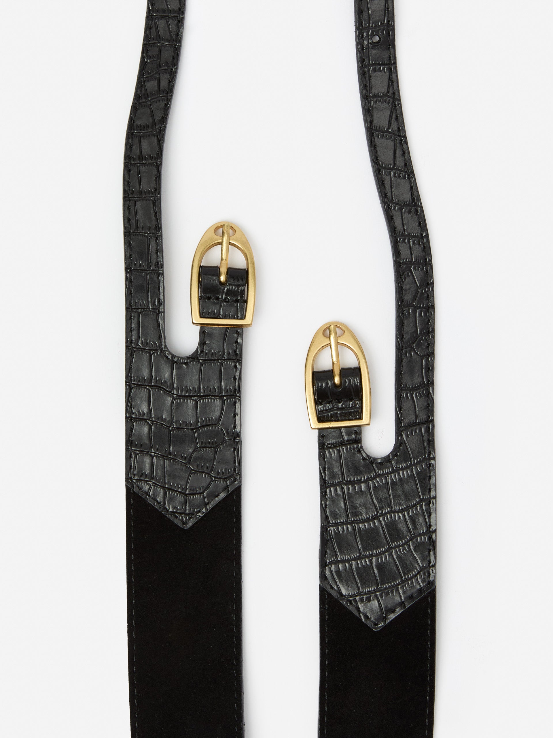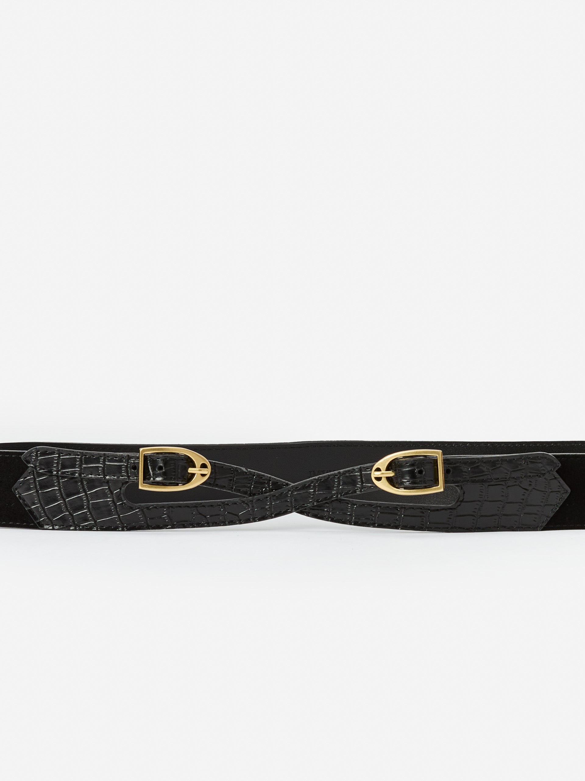 Add a bold finish with the Jimena Belt—crafted from supple suede and crocodile-embossed leather. Twin buckles bring a hint of equestrian-inspired charm, making it the versatile accessory your wardrobe needs.
