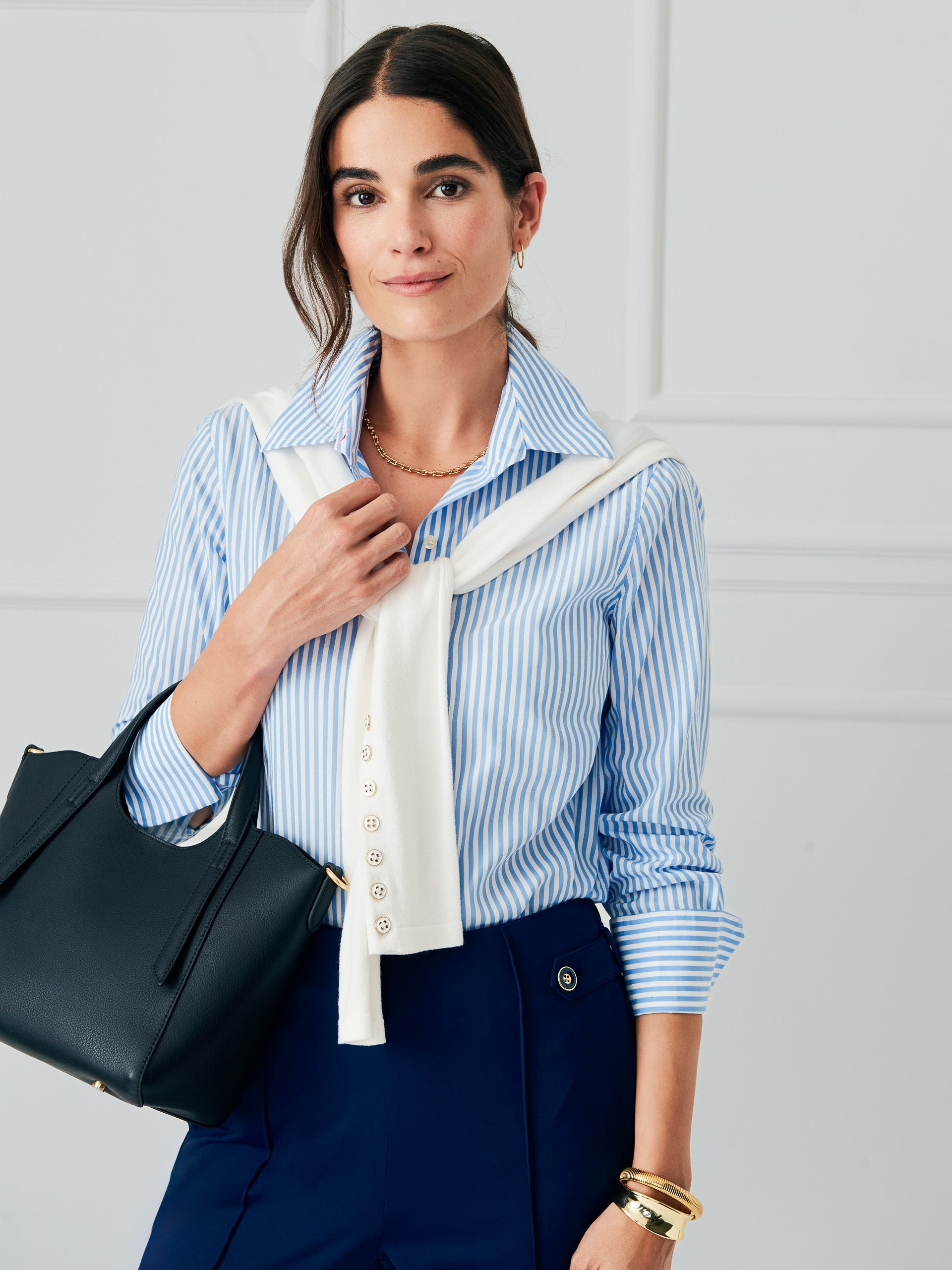 Long sleeves Shirt collar Button down Wide cuffs 100% Cotton Poplin Machine wash cold. Tumble dry low. Imported. Size & Fit26 1/2″ long from top of center back (size M) Model is 5’9″ and wearing a size XS
